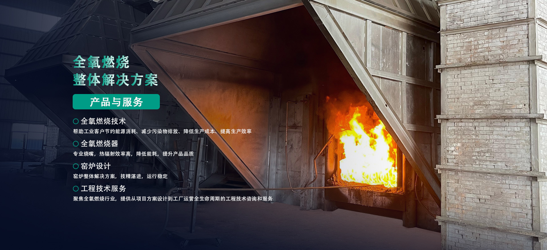 提供方案:成套熱能解決方案。高溫領域,采用富氧或全氧燃燒系統,包括窯爐控制系統、全氧燃燒閥組、燒槍組件等